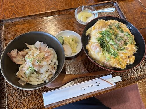 出社すると,急遽,現地での打合せのお話しが。。。 本日はファストプロミールをお弁当に持ってきたんやけども,まあ,致し方なし(笑) 久しぶりの「松よし」さんにてお昼 何かランチメニューも変わったようで,注文したシャモ親子丼とミニうどんのセットも…