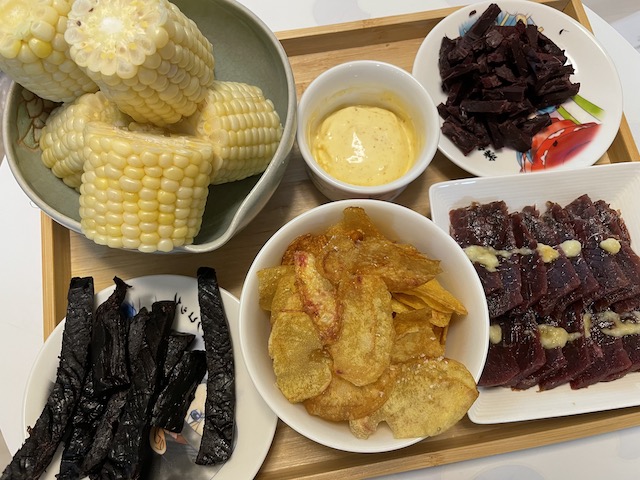 鯨のお刺身他,ヤングコーンにポテチは買ってきたお芋を揚げて。。。(笑)