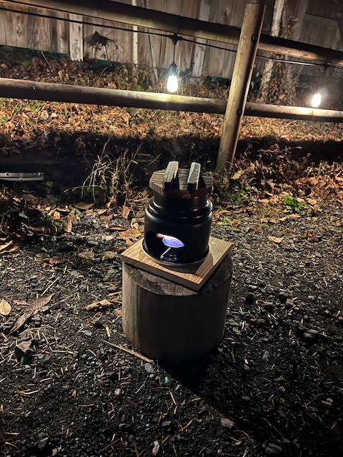 焚き火台周りのテーブルはふるさと納税の返礼品